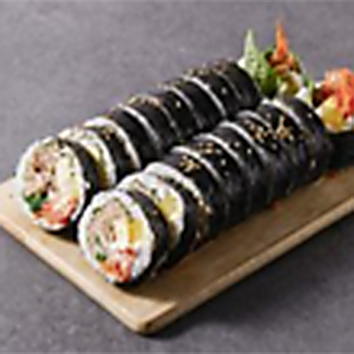 韓国料理で人気のキンパはごま油と塩で味付けしたご飯にほうれん草、人参、卵、カニカマなど定番具材を巻き込んだ人気メニュー。