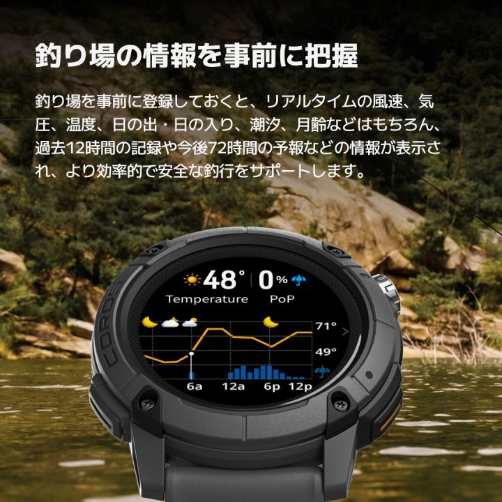 アウトドアに慣れ親しんだアングラー、ハイカーやトレイルランナー、そしてすべての冒険家のためにデザインされたCOROS NOMADは、多彩なフィッシングモードを搭載。