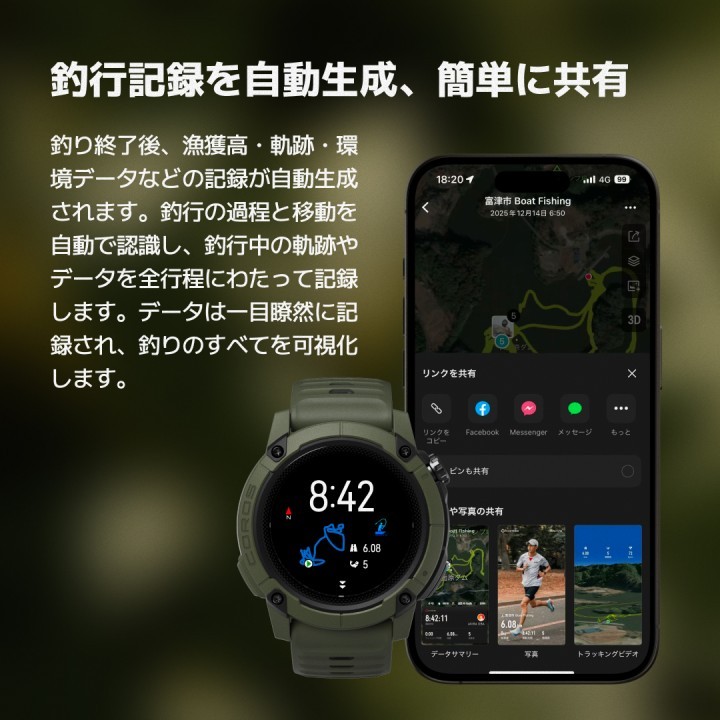 天気・潮汐の確認、釣りポイントの記録、帰宅後の分析まで、COROS NOMADは釣り人のためのスマートなフィッシングノートとなります。
