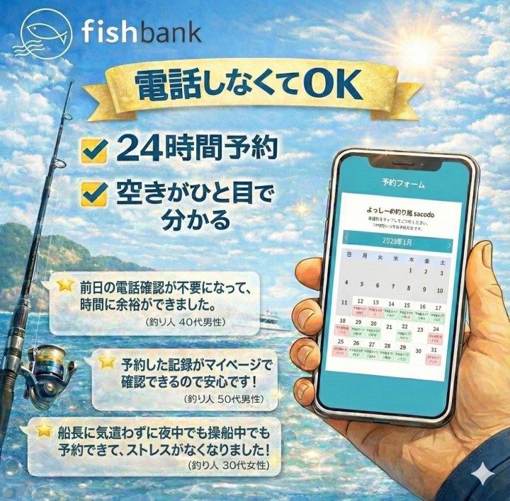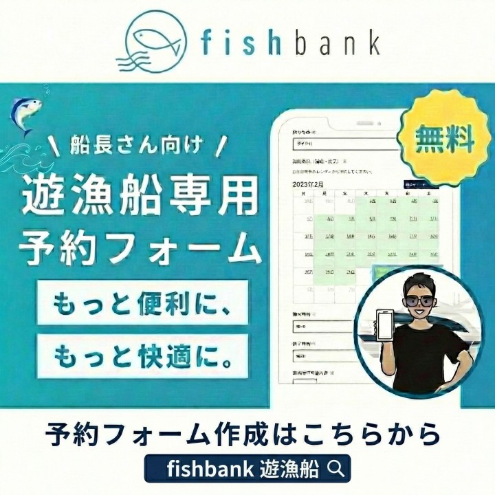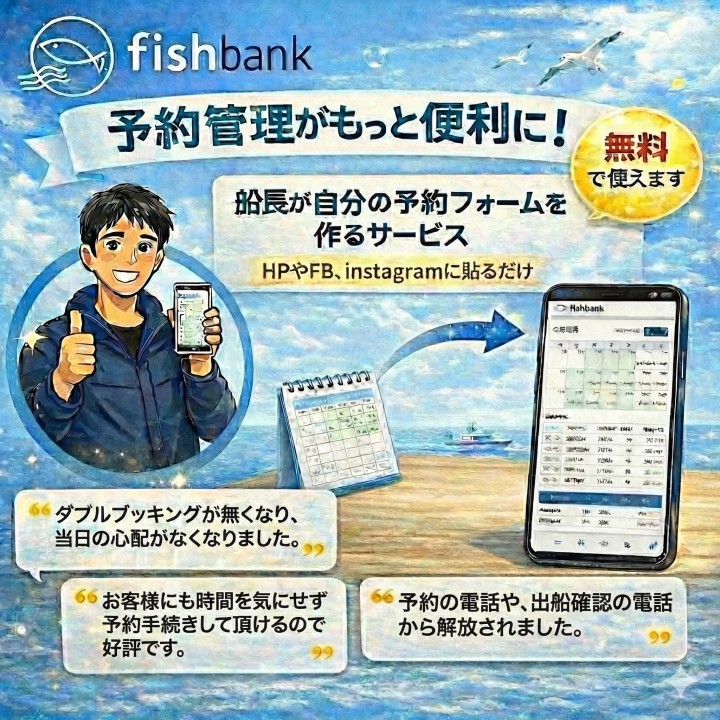 fishbankは、遊漁船の船長が自分専用の予約フォームを簡単に作成し、自社ホームページやInstagramに貼るだけで、すぐネット予約を受け付けられる無料サービスです。